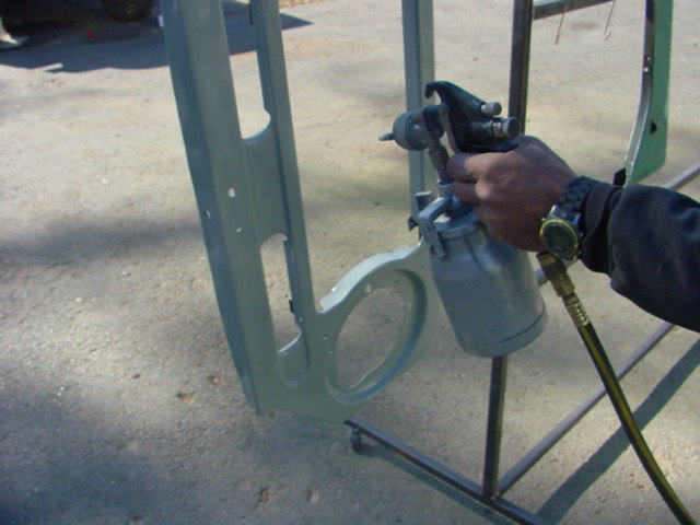 Drilling and tapping some frame and body part bolts that happened to get a tad stuck. I built some custom racks just for painting cruisers, they seem to work pretty well. Since the paint was in great shape we just sanded most of the body parts down so that the primer would adhere good and the minimal amount of body work could get done. The bluish stuff you see in these pics is a fine glaze that sticks well to small areas and is for finish filler work.