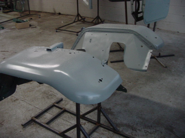 Ahhhhh the joys of bodywork....NOT!. You can see some of the cancer I mentioned earlier. We cut it out and finish ground it back to a factory fit, then glazed it, sanded and prepped it for priming. The pic of me is after priming. Usually we do an epoxy primer, grey primer, sealer buildup of primer coats, each 'layer' coat gets wet sanded with 400 grit. When the last wet sanding is done we wipe the parts dry, chemically clean, then tack cloth and its pretty much on to the finish coat.